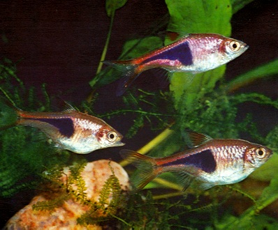 "Представьте себе миниатюрную рыбку, на каждой стороне тела которой находится по громадному удлиненному острому треугольнику темно-синего, стального цвета, расположенному на светло-голубом, местами отливающем в розовый цвет фоне. При этом хвостовой и спинной плавники ее окрашены в ярко-малиновый, как у красноперки, кровавый цвет, а остальные плавники бледно-розовые. Прелестная эта рыбка невелика, но так красива, что всякий, видевший ее, невольно ею залюбуется".