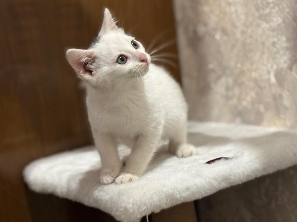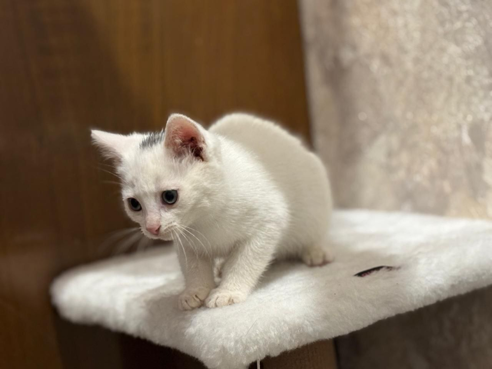 На затылке у Юки есть серое пятнышко, это отмечено местечко, где котейку надо гладить. А он и не против, он ручной, общительный малыш, он очень любит ласку. Попрыгать и поиграть он тоже любит, ведь он совсем маленький, ему всего два месяца.
