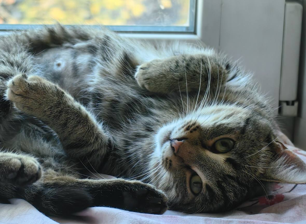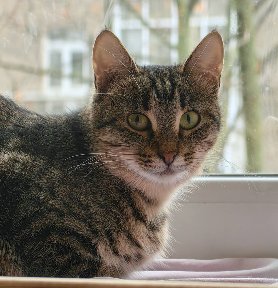 Кошечка стеснительная, скромная, застенчива. Игривая, но не навязчивая. Любит смотреть в окно. Очень любит, когда её гладят, начинает урчать и подставлять животик, но на ручках пока не сидит. В кровать так же пока не идёт. Пристраивается единственной любимицей. Кушает хорошо, лоток на отлично.