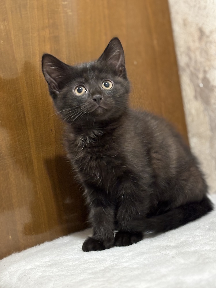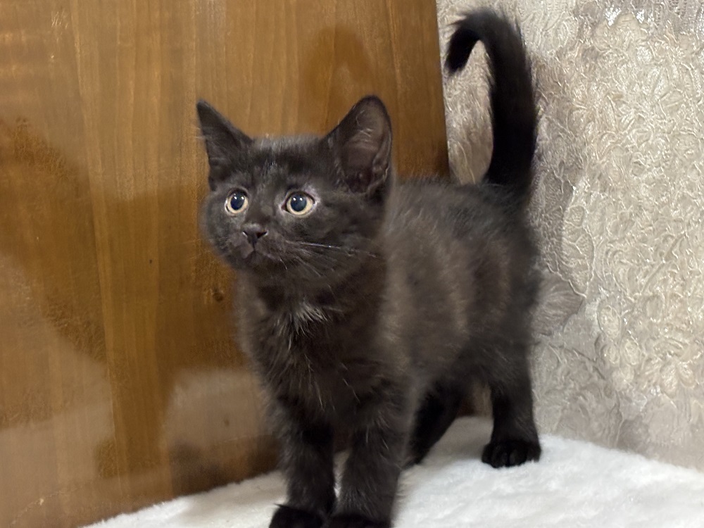 Черный мальчик хулиганчик Проша. Возраст 2 мес. Активный ребенок, любознательный. За ним глаз да глаз нужен, за секунду оказывается в самых разных местах. То сидит в стиральной машине, чуть отвернулся - ходит по сушилке. Чистоплотный, обработанный. К лоточку приучен.