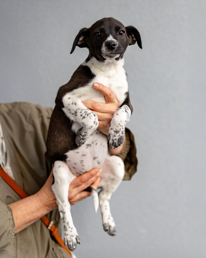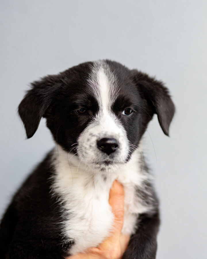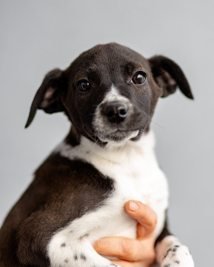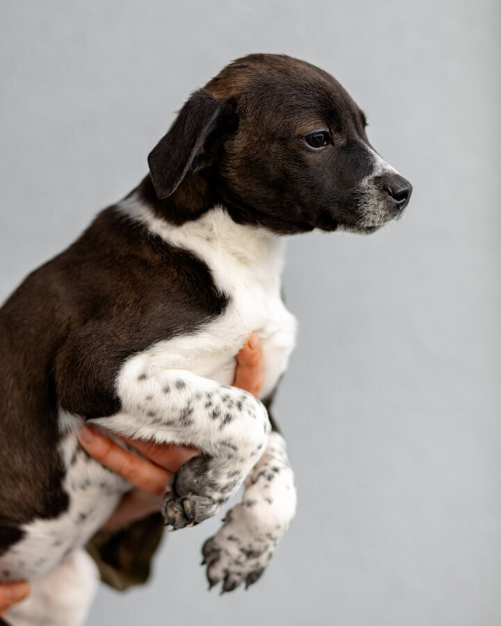 Кроха, выброшенная в морозы на споттинг - Чижик. Он весит сейчас примерно 4 кг. ему не больше 2- месяцев. Мальчик. Очень симпатичной расцветки. Белый с черным. Скорее всего будет крупным (в районе 20 кг), но не гигантом. Привит, здоров, жизнерадостен, не пуглив. Очень стремится к общению с человеком. Классный малец!