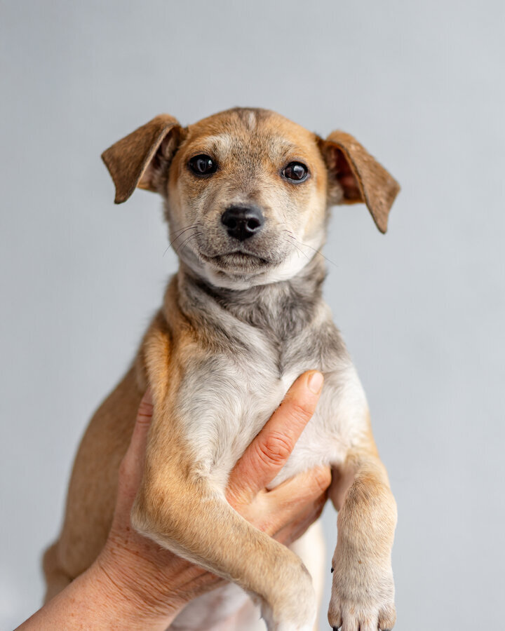 Печенька (бежевая) и Капучинка (шоколадная с белым) - им сейчас 4+ месяца. Девочки. Они здоровы и вакцинированы. Подвижные, веселые, с характером. Щенки весят сейчас около 4 кг. Они точно не будут больше, чем 10 кг, судя по размерам и весу в их возрасте.