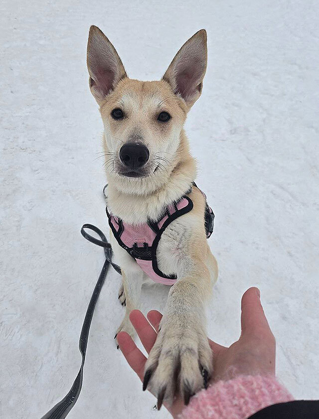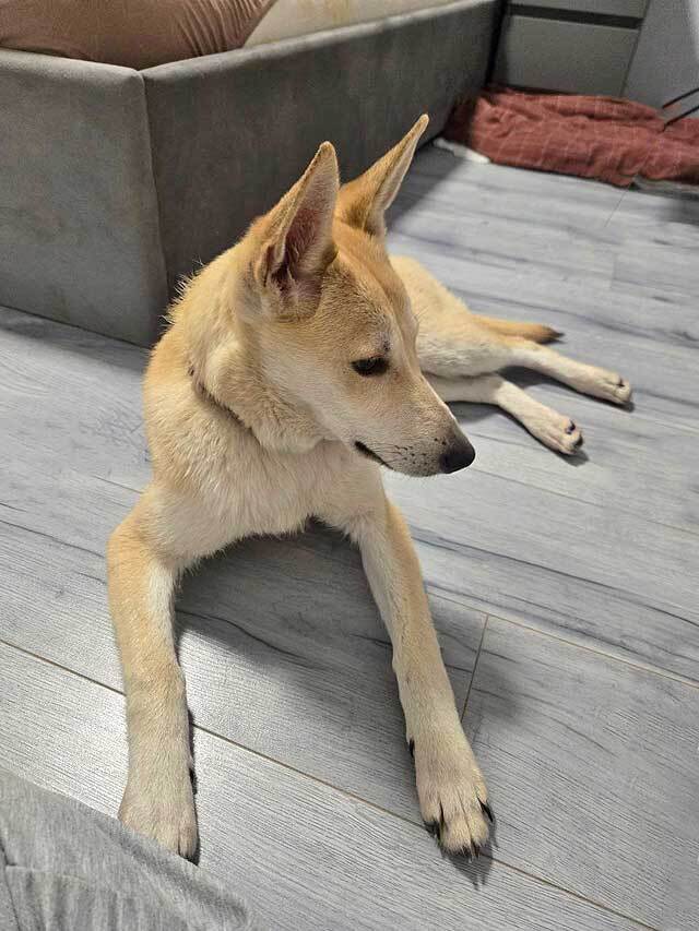 Чапе всего 6–8 месяцев, она ещё щенок — 14 кг любопытства, ума и чистой любви. Та самая собака, которая смотрит в глаза так, будто всё понимает. И, честно… она правда очень умная.