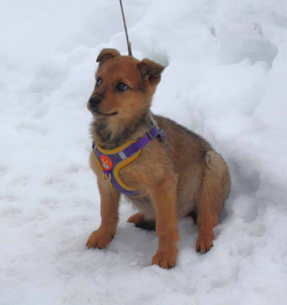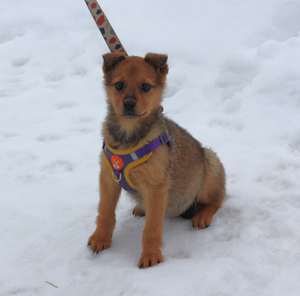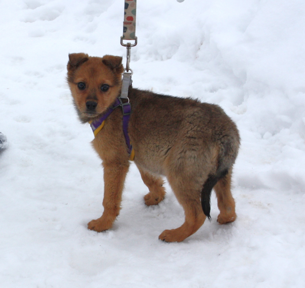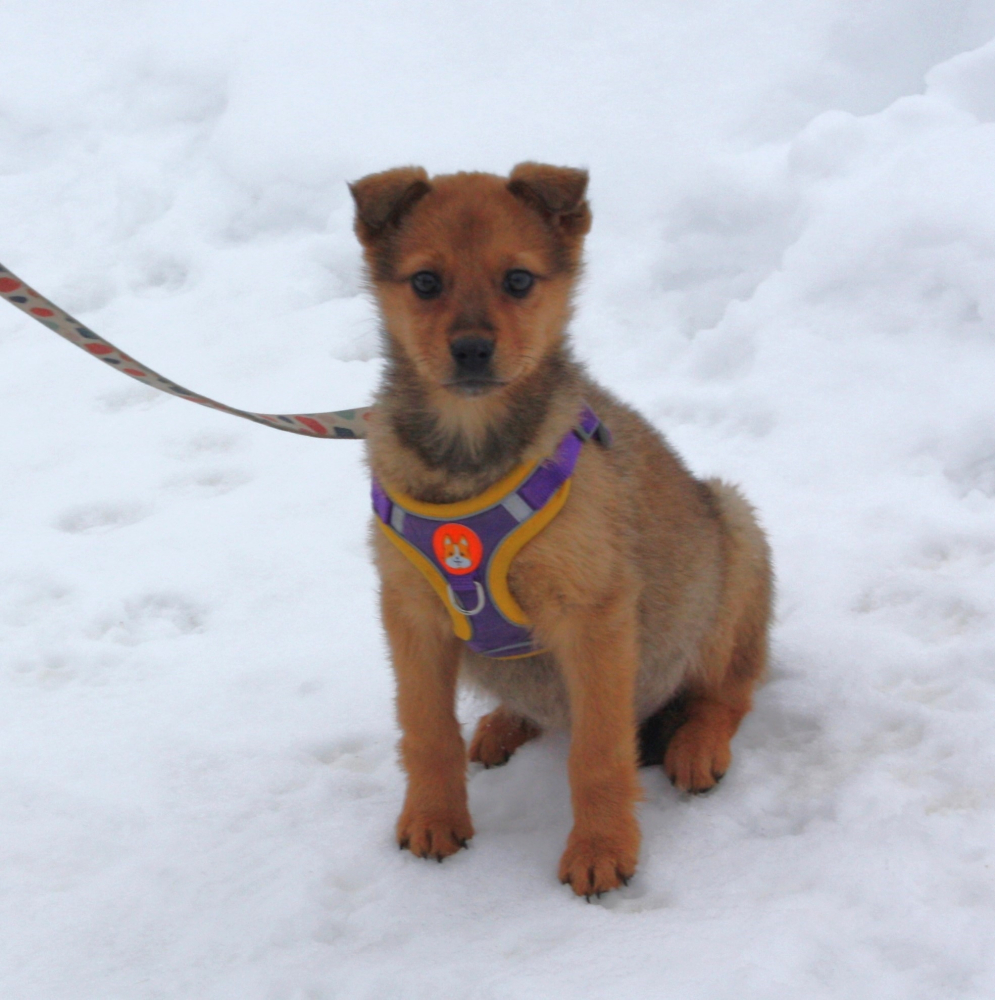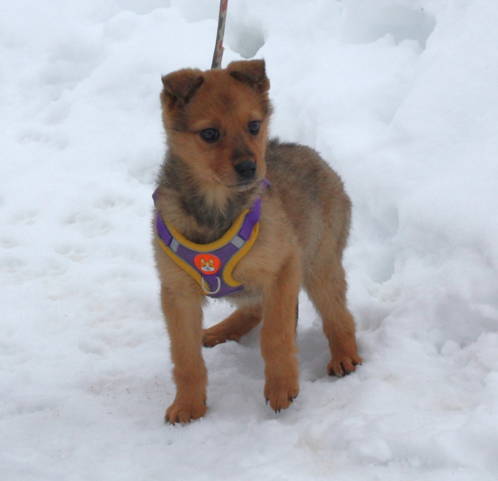 Лисёне всего 2- 2, 5 месяца, она проглистогонена, дважды вакцинирована , здорова, оформлен паспорт. Вырастет среднего размера- по колено.