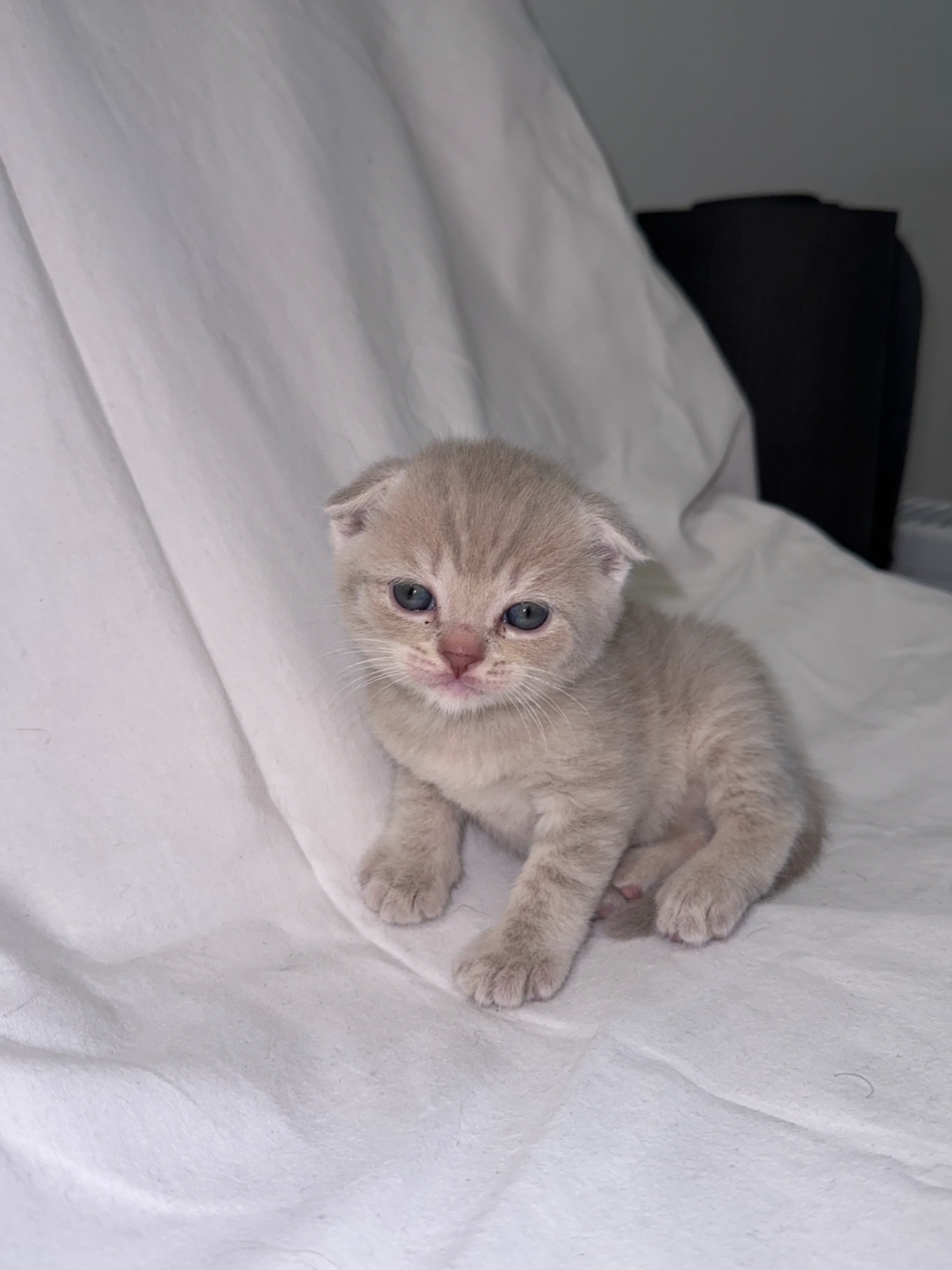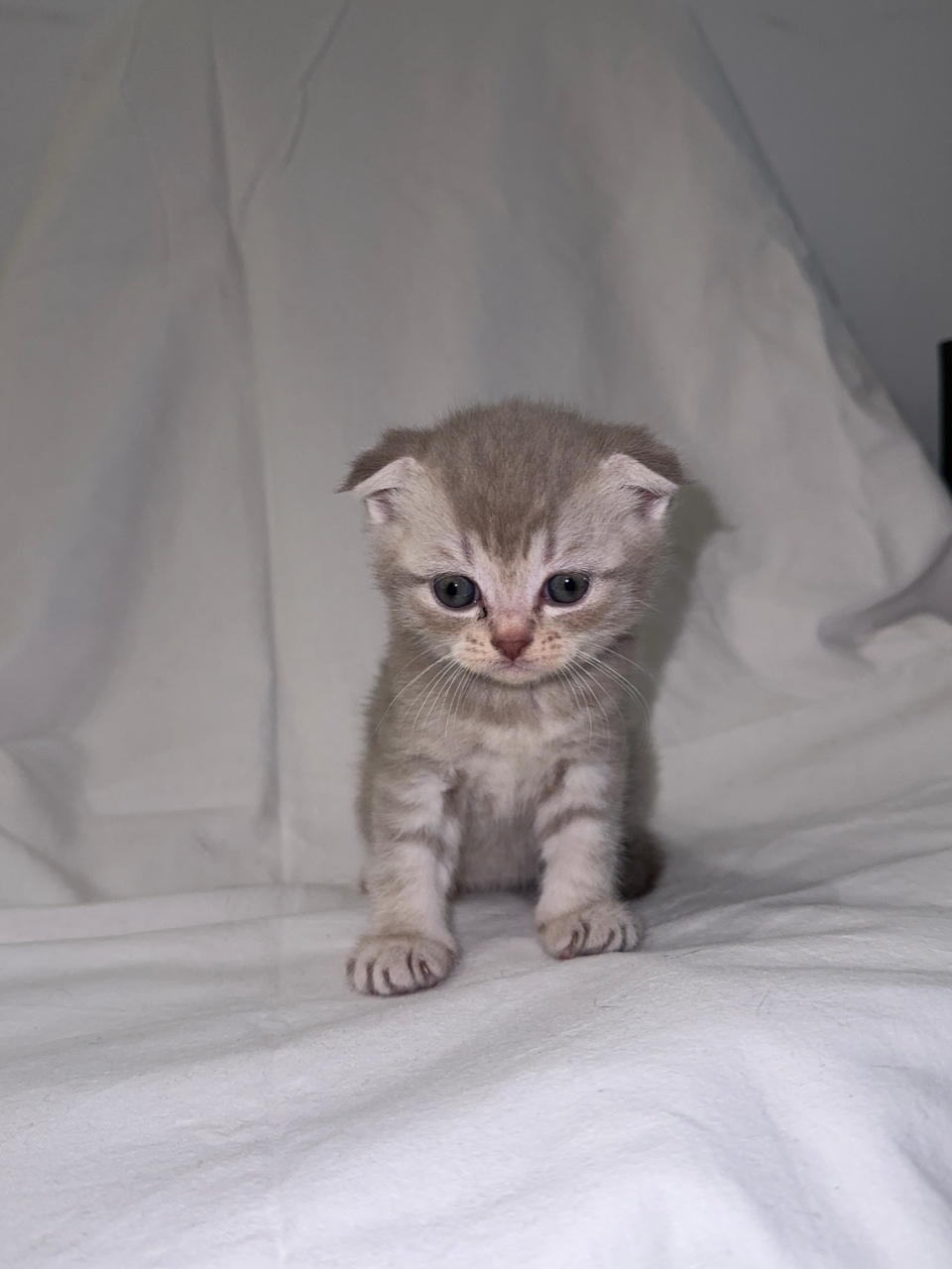 Мама: шотландская прямоухая кошка, окрас серебристая шиншилла, глаза золотистые.
