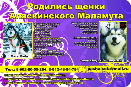 ![]() | Щенок аляскинского маламута (девочка) - с документами РКФ40000 Якутск18 апреля 2013Продается щенок аляскинского маламута (девочка) - с документами РКФ. Только в ответственные руки! Возможна доставка. мать Виби (чистые американски… |