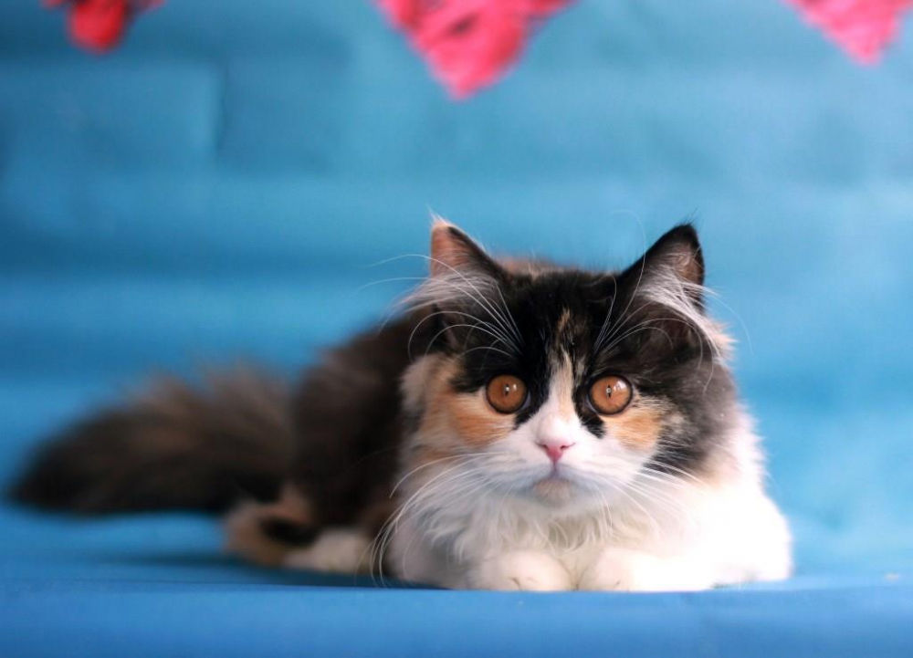 Первые 3 фото-полудлинношерстная лоскутная девочка-спокойная, игривая, плотная, тяжелая с искусно подведенными создателем яркими глазами.Много красного.