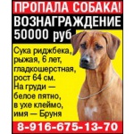 ![]() | Пропала собака150000 ищу пропавшегоМосква30 апреля 2014В октябре 2013 г. в Ботаническом саду пропала девочка риджбека - БРУНЯ, рыжая, гладкошерстная, темная мордочка, в ухе хорошо читаемое клеймо, на груди… |