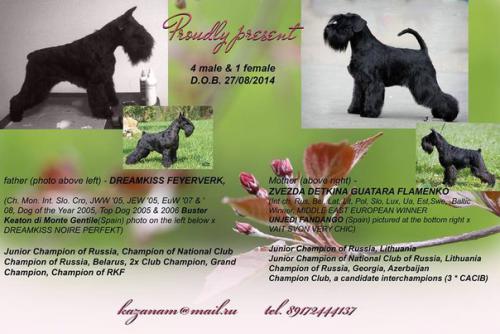 ![]() | Щенки черного цвергшнауцера15000 24 июня 2015Продаются щенки черного цвергшнауцера от чемпионов 04. 05. 2015 года рождения. 3 мальчика и 3 девочки, родословная РКФ, ветеринарный паспорт. Миниатюр… |