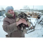 Мать немного выше колена, похожа на метиса лайки/хаски, серебристого окраса.