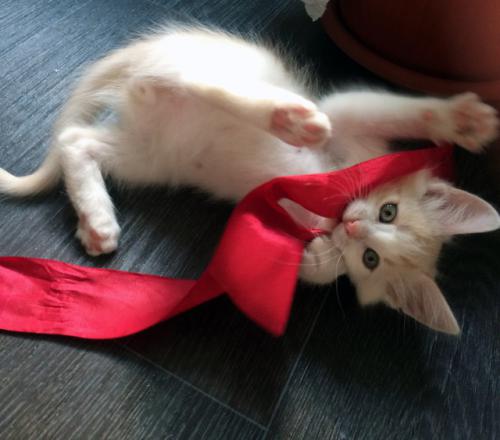 1)Отважный и ласковый котик-малыш Вася. Парень белого окраса с кремово-рыжими отметинами. Растет лидером — в меру активный, любит поесть, поиграть и поспать.